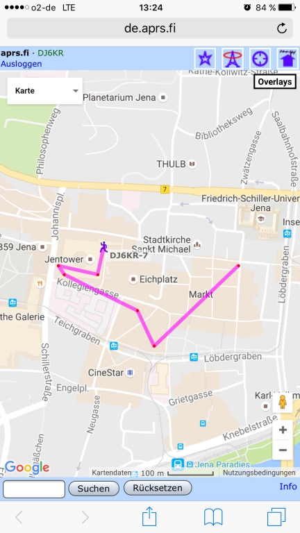 Es geht los! Und wohin? Das verrät >APRS<. Dank Severin DK1SEV, und dem OV X22 verfügt Jena nun über ein IGate in der Clubstation an der Ernst Abbe Hochschule. Die Abdeckung des IGates kann sich sehen lassen. 1 Watt Sendeleistung reicht an meinem FT-1XDE aus um einen fast Lückenlosen Pfade beim meinem Weg quer durch die Stadt an aprs.fi zu vermitteln. Danke dafür!
