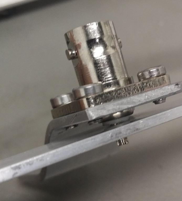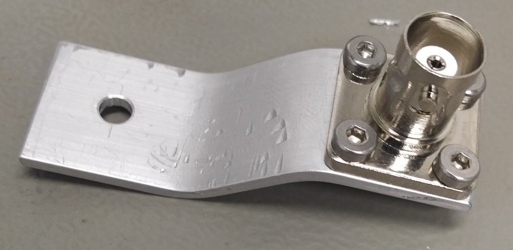 Nachdem ich diese Anleitung schon einige Wochen in meiner Todo-Liste hatte, habe ich mich nun endlich dazu durchgerungen den Bau zu beginnen. Dabei habe ich zwei kleine Anpassungen an der Anleitung von Rüdiger vorgenommen: Ich wollte die Antenne gern mit einem BNC-Anschluss herstellen und musste dazu die Halterung der Buchse verändern, und ich habe im Baumarkt auf die Schnelle nur 20mm breite Aluschienen bekommen (diese dafür aber 2m lang), so dass ich die beiden äußeren Verbindungslöcher zwischen den einzelnen Elementen 10mm vom Rand entfernt angebracht habe. Nach einiger Zeit hatte ich alle Bauteile hergestellt. Das aufwendigste dabei war die Halterung für den BNC-Stecker, wie auf den Bildern zu sehen ist. Die Masse des BNC-Anschlusses wird über die vier Schrauben an den Rahmen angeschlossen, und die Seele ist in einem leicht untermaßigen Loch im entsprechenden Aluteil eingepresst: