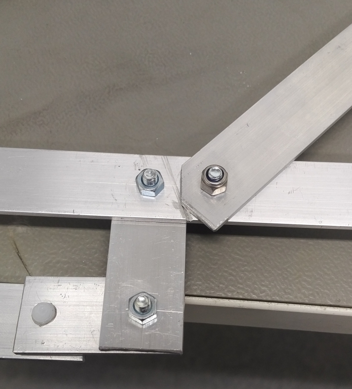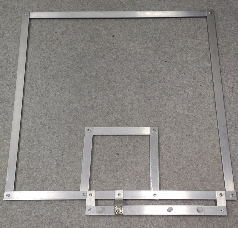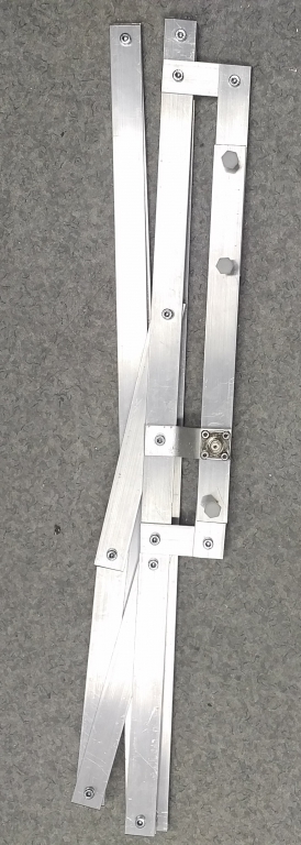 Die Montage der Antennenteile ging dann recht schnell – alle Komponenten wurden miteinander verschraubt, wie in der Anleitung von Rüdiger beschrieben. Dabei habe ich den senkrechten Balken an der unteren rechten Ecke mit einigen Muttern auf einen etwas weiteren Abstand zum waagerechten Balken gebracht, damit sich die Antenne leichter zusammenfalten lässt. Erst im Nachhinein ist mir aufgefallen dass sich durch meine Wahl von etwas breiteren Aluschienen der kleine, innere Rahmen nicht mehr zusammenfalten lässt – ich musste von einem der Streifen deshalb noch eine kleine Ecke absägen. Als das geschafft war, war die Antenne auch schon fertig: