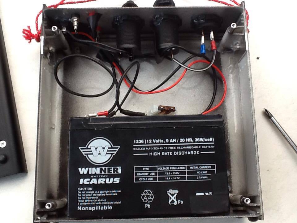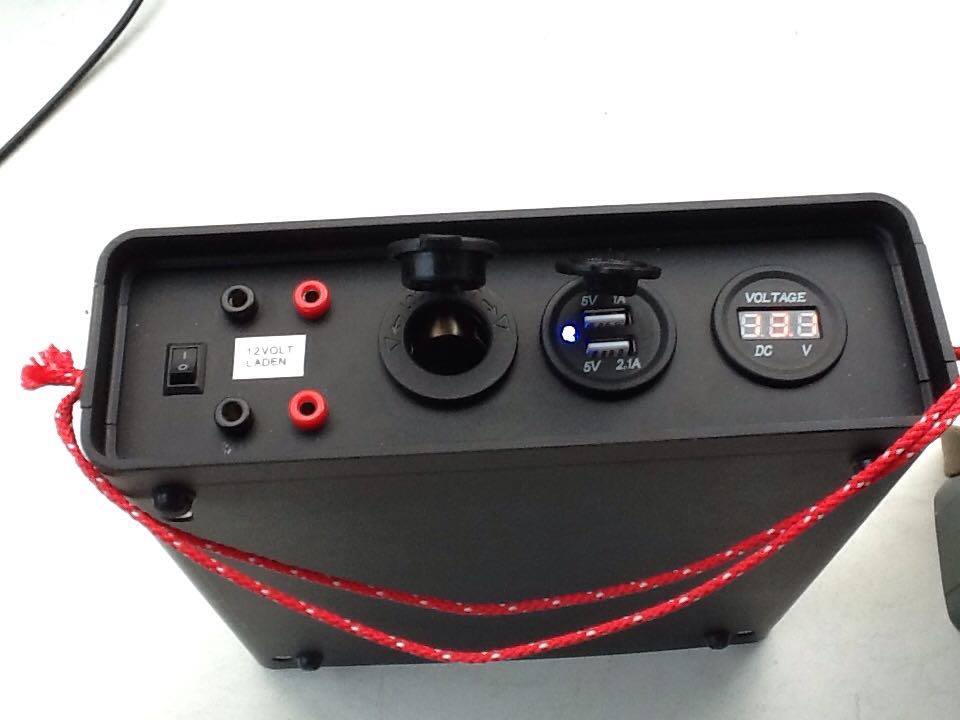 Da ich 2 Gehäuse bestellt hatte, nahm ich mir dieses vor! Ein Passender Bleigeelakku war schnell gefunden. 12 Volt 9ah. Voltanzeige, USB lader sollte auch dran. Also bestellte ich solche Sachen ebenfalls bei EBay. Im Kfz Zubehör würde ich fündig.Gehäuse umlackiert ein paar Löcher für die Geräte gebohrt und entsprechend angeschlossen.Die schwarze und rote Banensteckerbuchse dienen zur Stromversorgung und werden auch zum Laden der Akkus benutz. Dafür hab ich ein Ladegerät für Bleigeelakkus entsprechend mit Bananensteckern versehen.